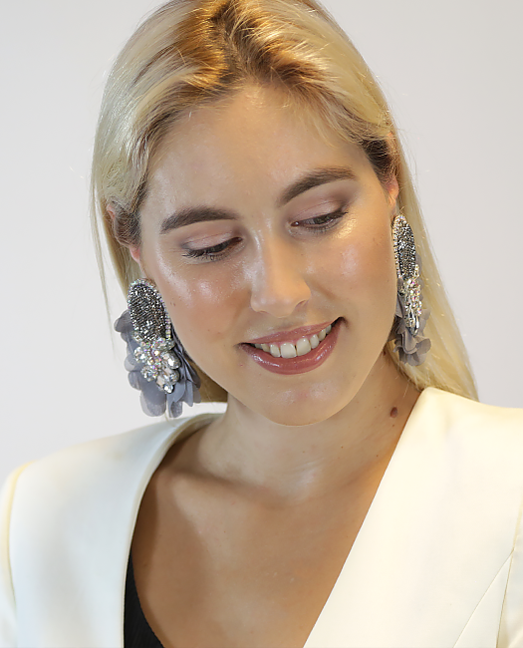 Earring that exudes pure elegance and luxury. Graceful, stylish, and versatile enough for everyday wear. The combination of shimmering stones and fabric flowers adds an extra touch of femininity to these earrings.