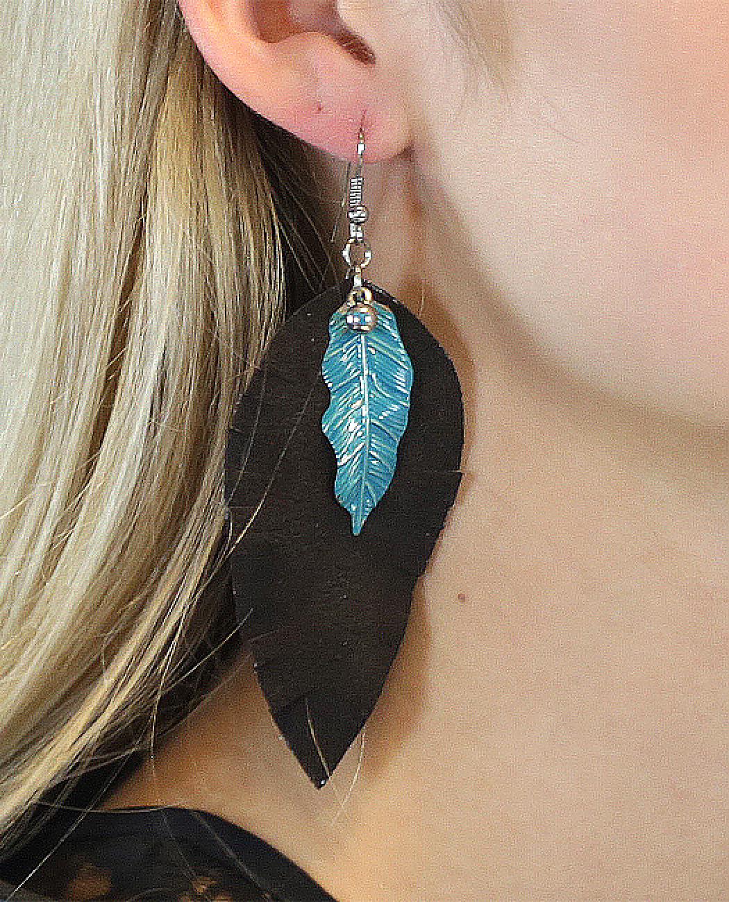 How adorable are these earrings? The blue leaf on the black leather leaf is truly an eye-catcher. The pendant is made of real leather, which gives it a supple feel. Add that extra touch to your outfit with these earrings.