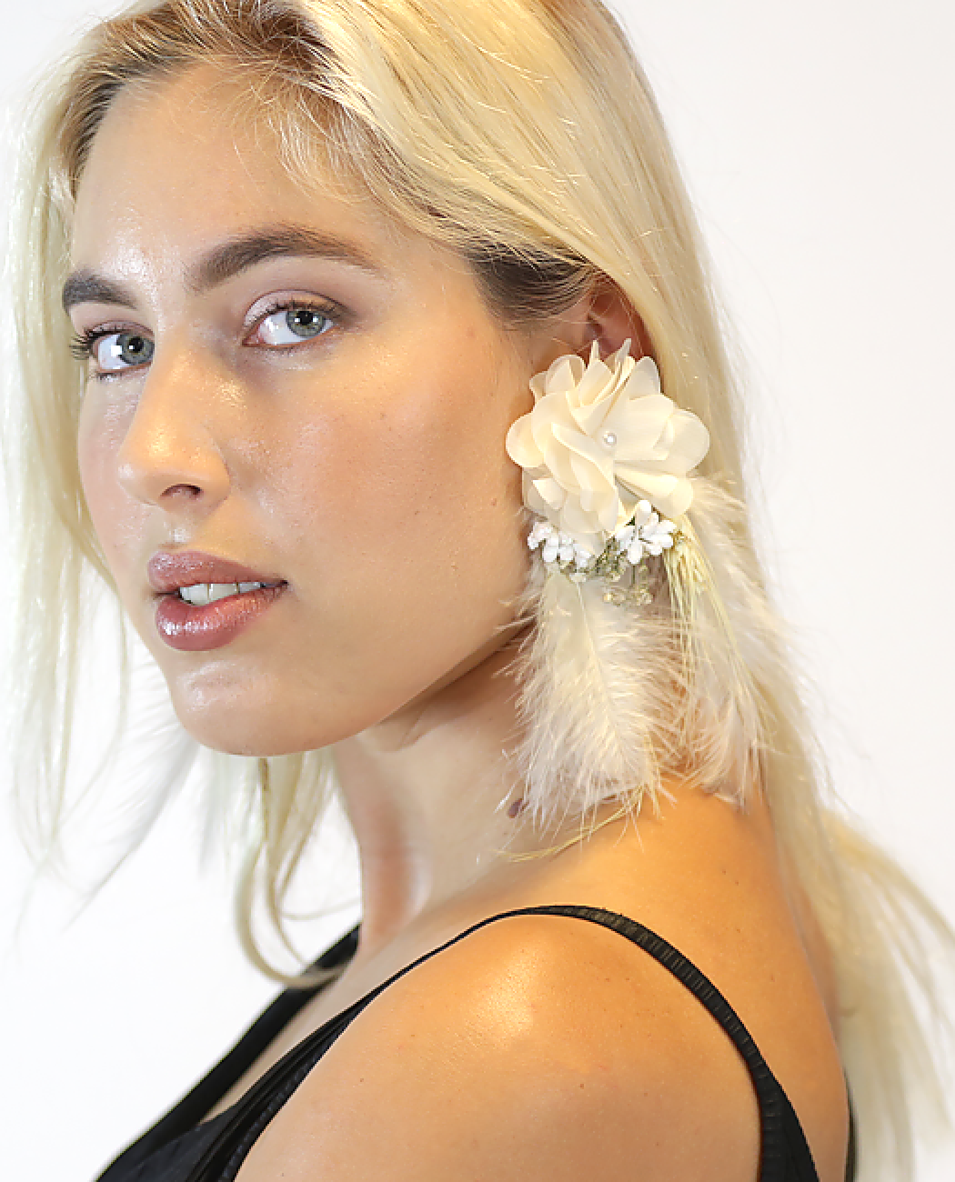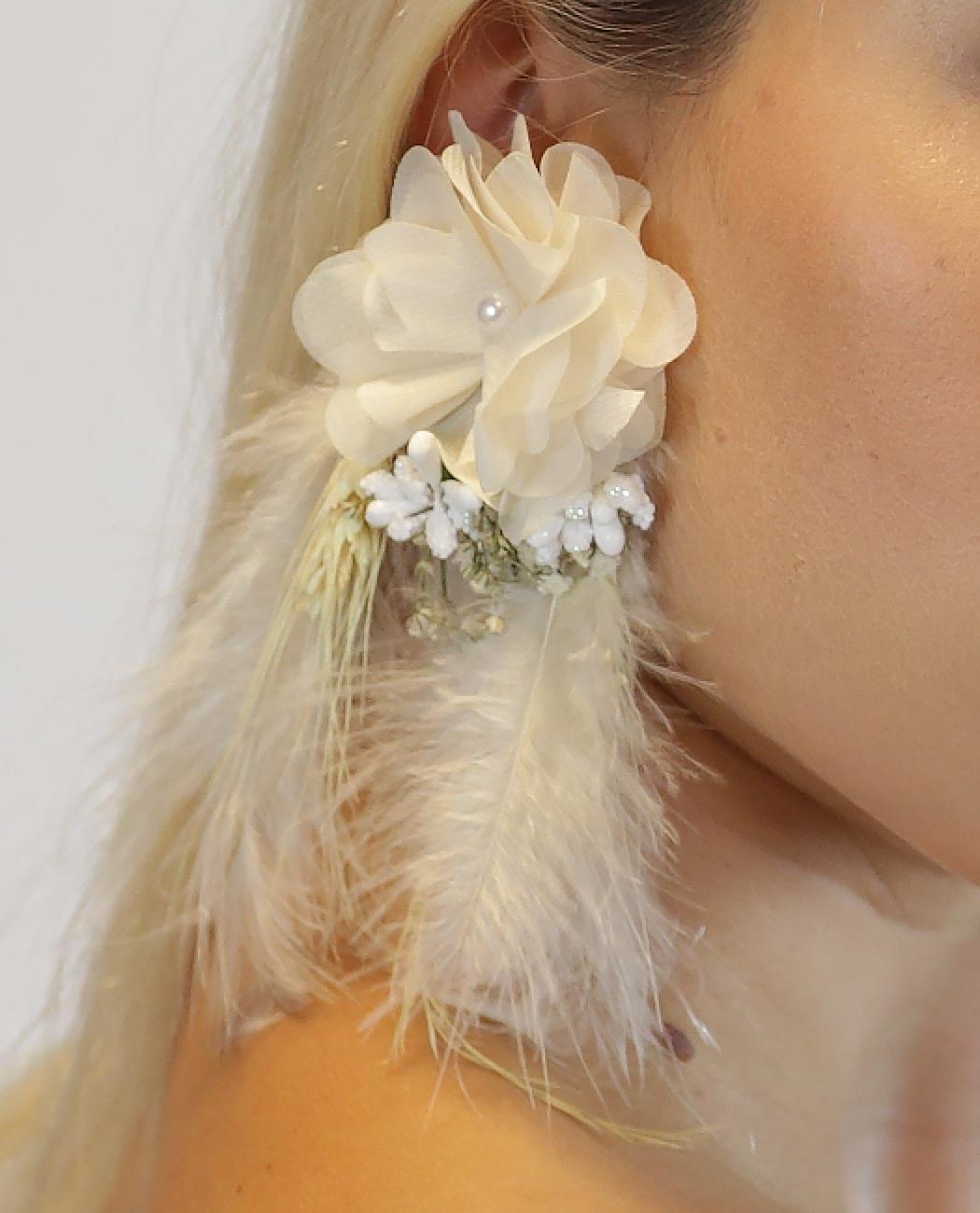 If you're aiming for a bohemian look, this earring is an absolute gem. The gentle feathers lend a playful and whimsical effect to your outfit, while the fabric flower adds the perfect finishing touch. Together, they create a stunning ensemble that captures the essence of boho chic.